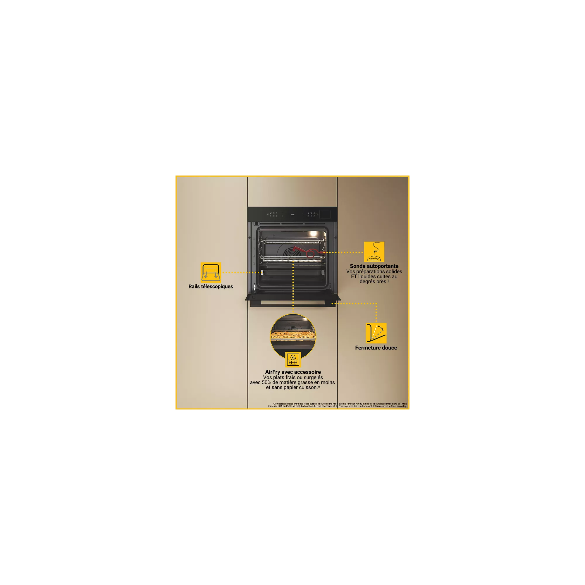 - Rails télescopiques + porte froide : sécurité et confort à chaque cuisson.