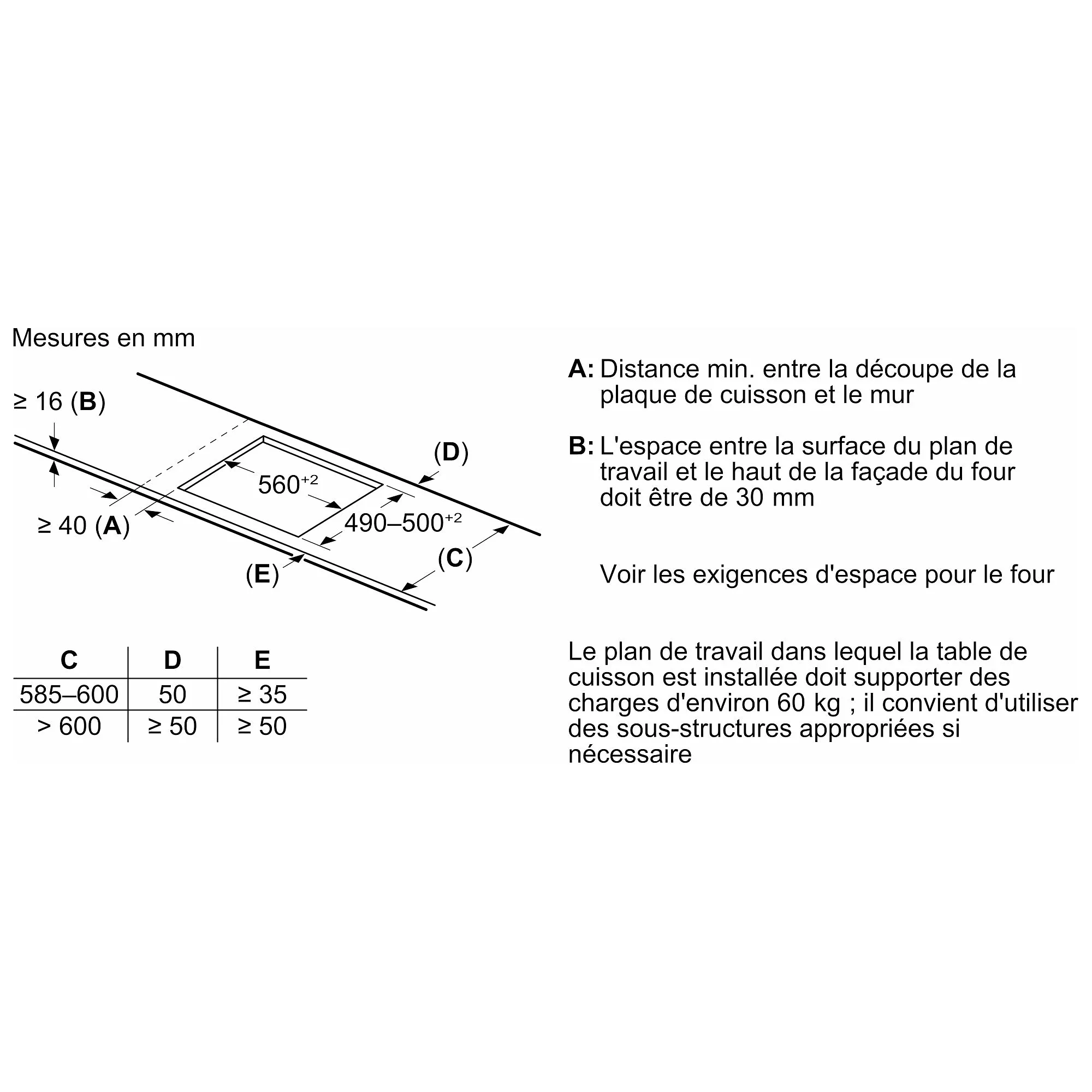 - Encastrement (L x P) : env. 56 x 49 cm